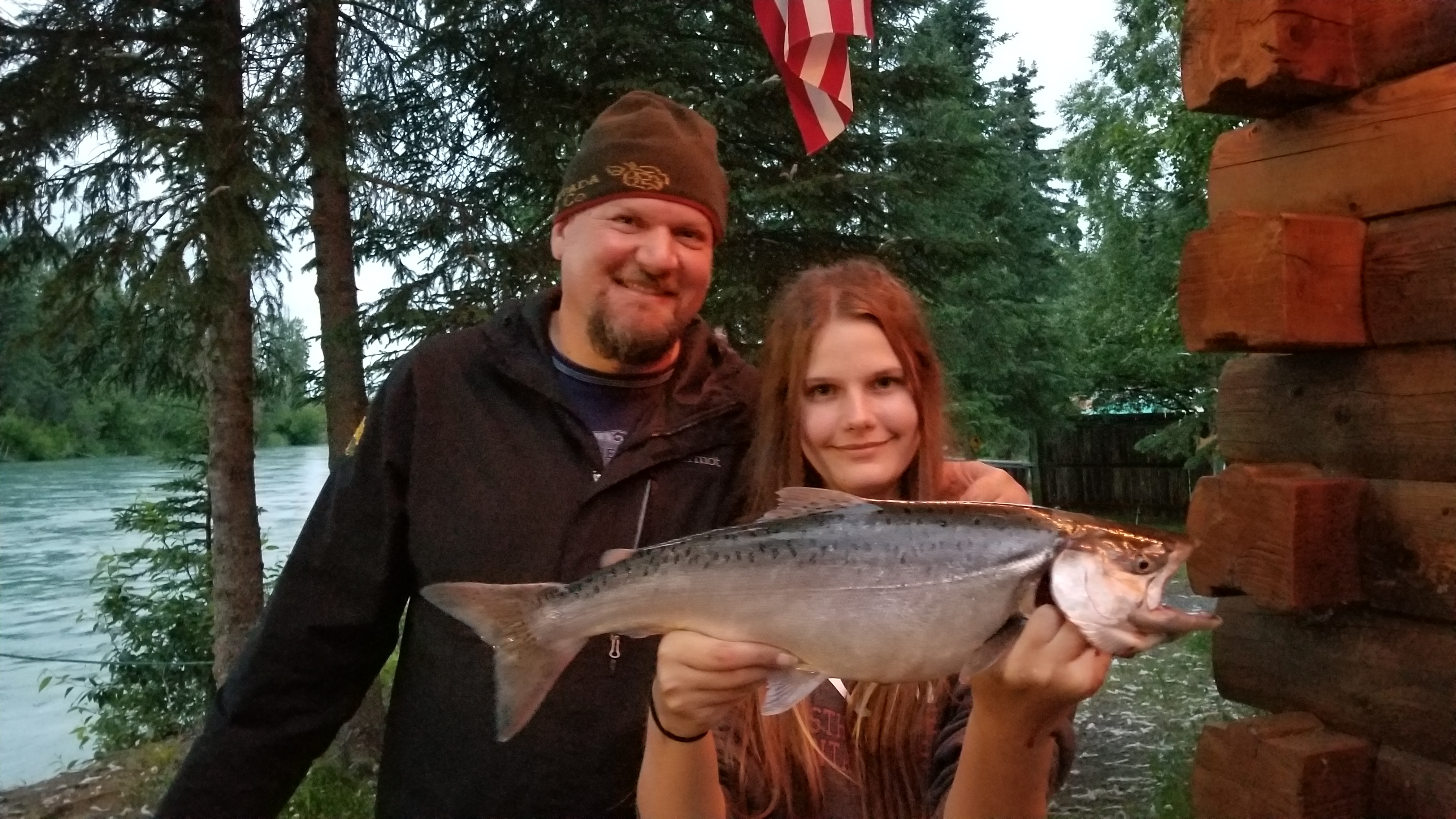 Nick & Kennedy of Northern Californina enjoyed some quality father-daughter time on our Kenai River floating dock this evening, a beautiful evening with fish happening, at the end of their Alaska Dream trip!
