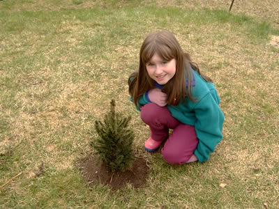 “…temps are warming nicely into the 60’s on sunny days, but more importantly staying above 40 at night, so we’re getting some planting done and looking forward to summer! The trees are all budding nicely and with a little rain we’ll burst into summer green any day now. Here’s a picture of Alli and her tree that she planted in the front yard! See you soon at Kenai Riverfront!”